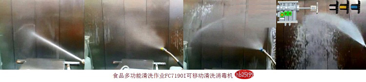 清洗设备,以“高压水冲洗-喷泡沫洁剂-喷消毒剂”多种方式进行对食品工厂车间机械设备、地面、台面、容器具、车辆等的清洗与清洁;可适用于肉食品厂、果蔬加工、啤酒饮料厂、水产加工等相关食品行业的清洁应用上 技术参数: